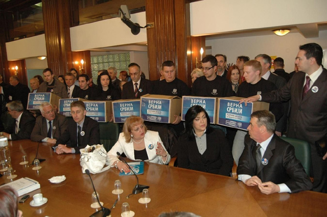 Jadranka Šešelj, kandidatkinja Srpske radikalne stranke (SRS) za predsedničke izbore zakazane za šesti maj 2012, posle današnje predaje kandidature Republičkoj izbornoj komisiji