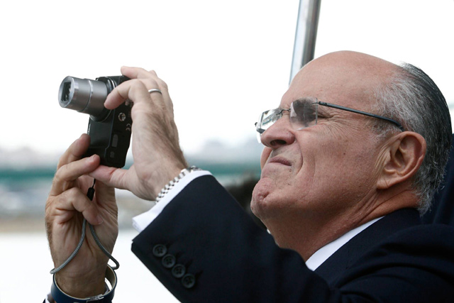 Bivši Gradonačelnik Njujorka Rudolf Đulijani snima fotografiju tokom vožnje brodom "Zlatno srce" po Savi, gde se sastao sa kandidatom Srpske napredne stranke za gradonačelnika Beograda Aleksandarom Vučićem