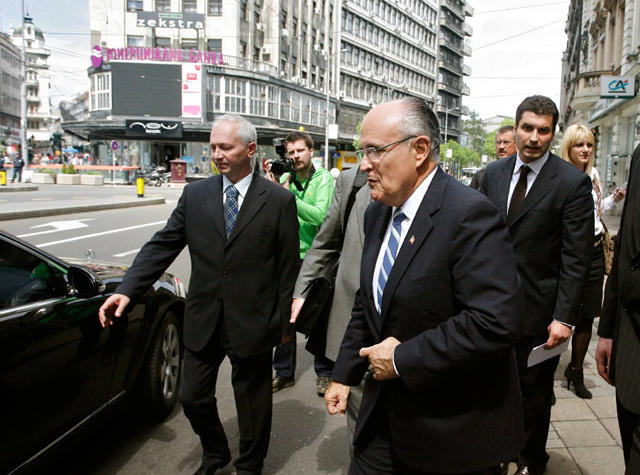 Bivši gradonačelnik Njujorka Rudolf Đulijani odlazi iz Medija centru u Beogradu, gde je održao konferenciju za novinare