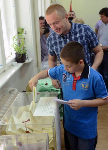 Sin potpredsednika Demokratske stranke i kandidata za premijera Vojvodine Bojana Pajtića umesto svog oca ubacuje glasački listić u glasačku kutiju na biračkom mestu u Mesnoj zajednici "Prva vojvođanska brigada" u Novom Sadu