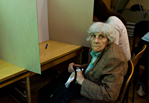 Žena se priprema za glasanje na biračkom mestu u Svetosavskoj omladinskoj zajednici u beogradskoj opštini Stari grad
