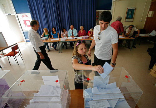 Devojčica umesto svog oca ubacuje glasački listić u glasačku kutiju na biračkom mestu broj 58 u osnovnoj školi "Kralj Aleksandar Prvi" u Novom Beogradu