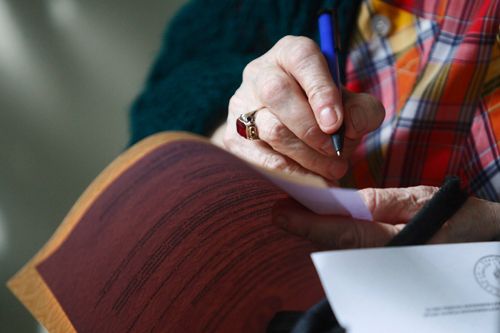 Žena popunjava glasački listić na biračkom mestu 34 u beogradskoj opštini Stari grad