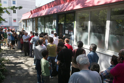 Glasači čekaju u redu ispred biračkog mesta u mesnoj zajednici Cerak u Beogradu