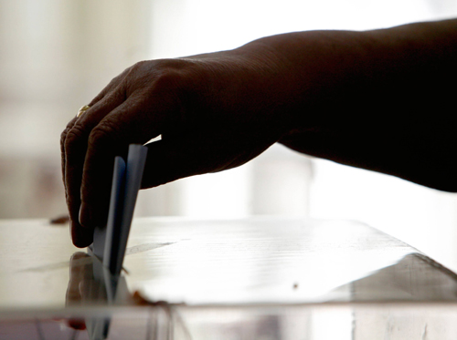 Žena ubacuje glasački listić u glasačku kutiju na biračkom mestu broj 58 u osnovnoj školi "Kralj Aleksandar Prvi" u Novom Beogradu