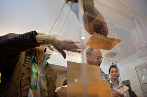 Glasači ubacuju glasačke listiće u glasačku kutiju na biračkom mestu u Svetosavskoj omladinskoj zajednici u beogradskoj opštini Stari grad