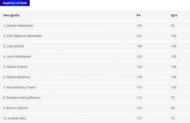 Pomenuti trio Hokinson, SAG, Dončić predvodi "selektora" po broju donetih poena, a u prvih deset su još Markanen, Nikola Vučević, Karl-Entoni Tauns, Ronde Holis Džeferson, Bruno Kaboklo i Andres Felis.