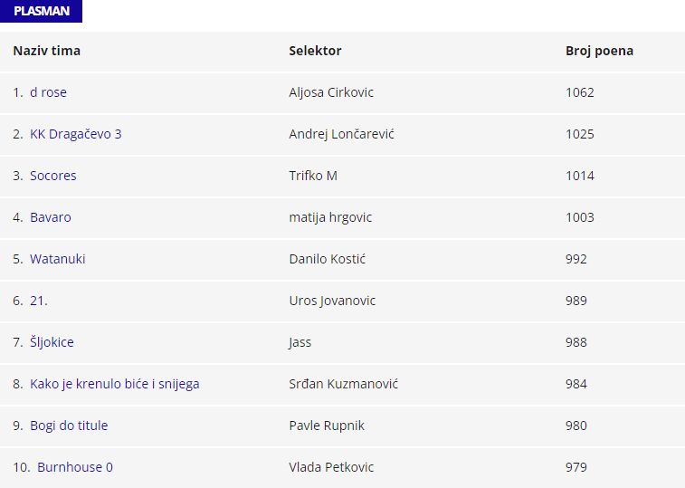 Treći su "Socores" sa 1.014, a četvrti tim sa preko hiljdu poena je "Bavaro" sa 1.003.