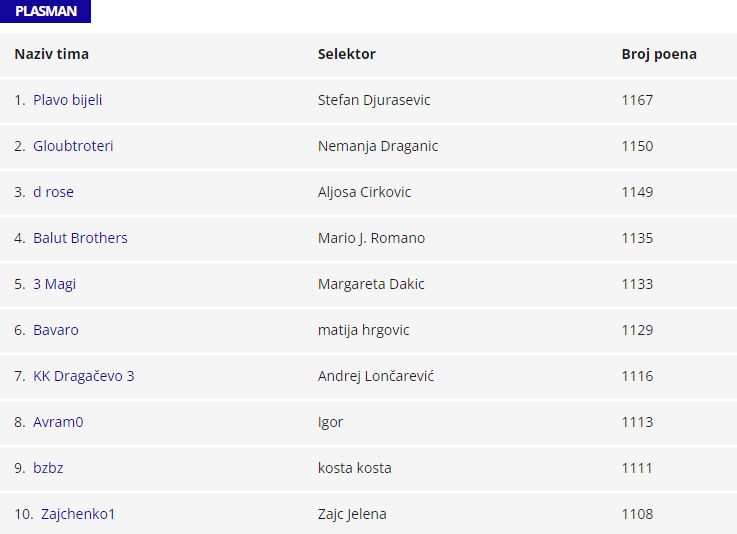 Lider "selektora" je ekipa "Plavo bijeli" sa 1.167 bodova, ali samo 17 manje imaju "Gloubtroteri".